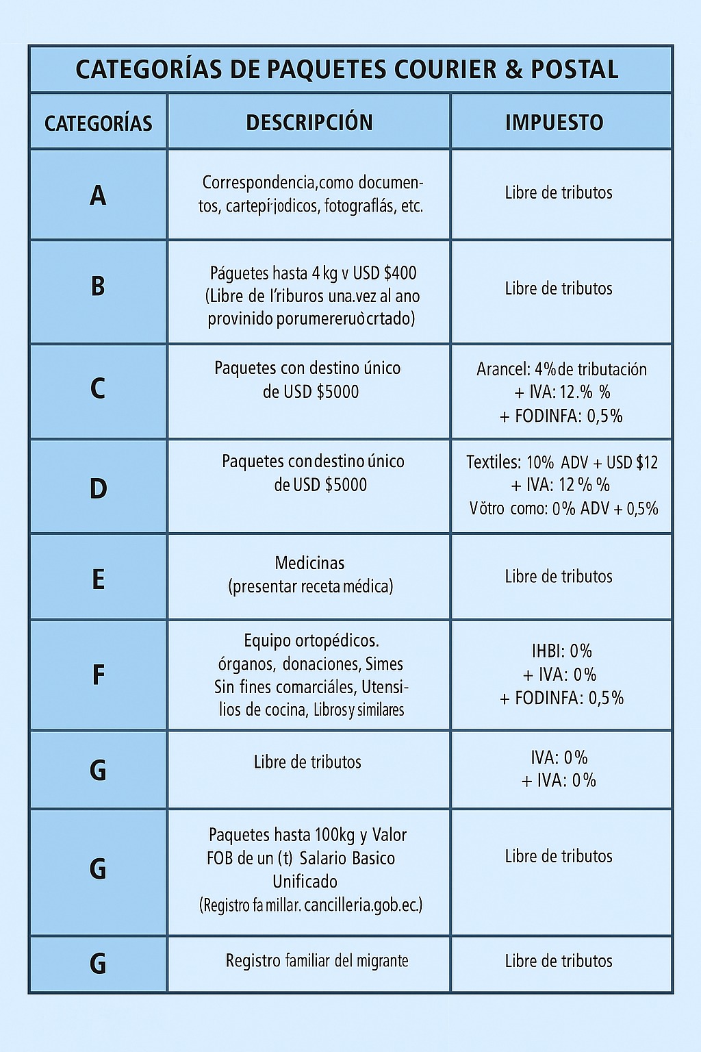 Se incluyen en esta categoría los paquetes cuyo peso no supere los cuatro kilogramos y cuyo valor FOB sea igual o inferior a cuatrocientos dólares de los Estados Unidos de América (USD 400.00), o su equivalente en otra moneda. Estos envíos deben contener únicamente mercancías sin fines comerciales. Para beneficiarse de esta categoría, tanto el peso como el valor del paquete deben cumplir simultáneamente con los límites establecidos. Además, el destinatario está obligado a presentar la Declaración Aduanera junto con los documentos de respaldo y acompañamiento requeridos conforme a la normativa legal vigente. Nota: Si al momento de pasar proceso de aduana su paquete tiene una propuesta de valor por la Senae tiene que pagar los impuestos pertinentes. https://www.aduana.gob.ec/